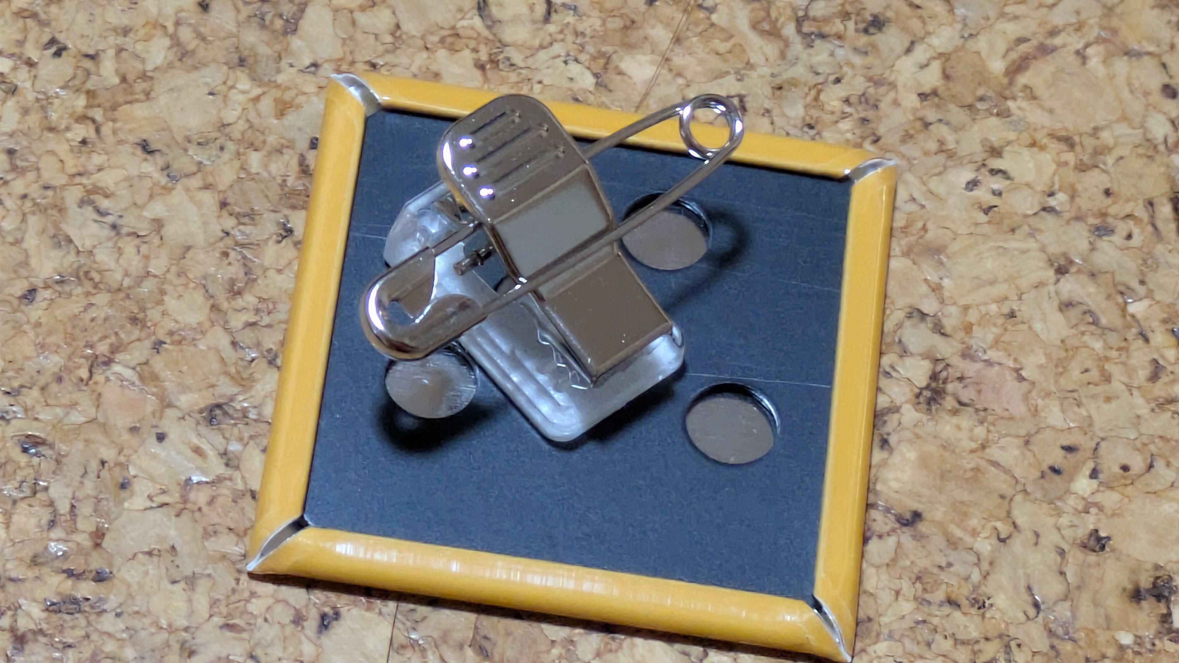 背面の留め具を安全ピンにしてみました。(ひし形のものはクリップ付)